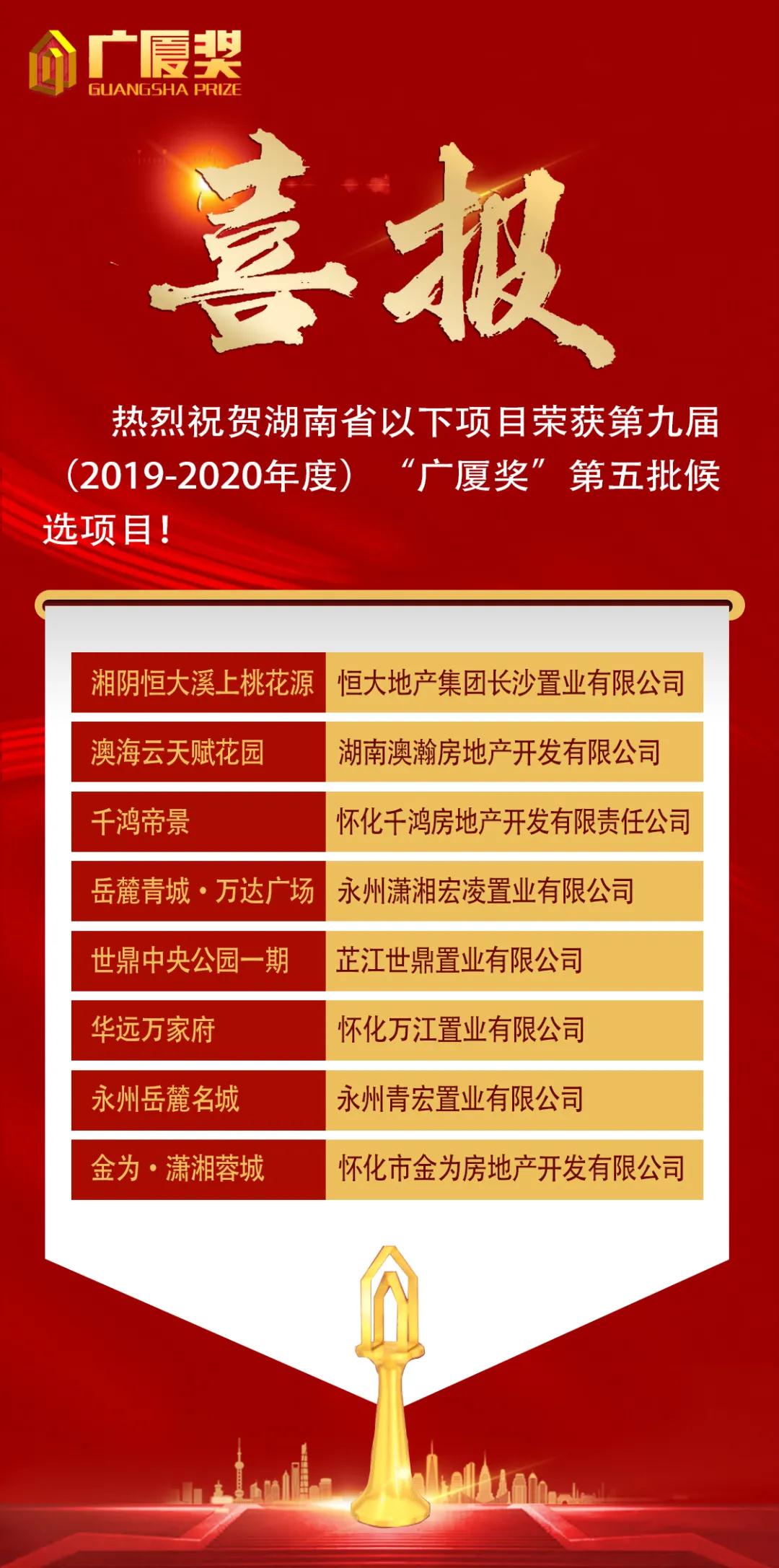 10月27日,由中國房地產(chǎn)業(yè)協(xié)會、住房和城鄉(xiāng)建設部住宅產(chǎn)業(yè)化促進中心共同組織的第九屆(2019-2020)年度 “廣廈獎”第五批候選項目名單重磅出爐!經(jīng)湖南省房地產(chǎn)業(yè)協(xié)會初審推薦的八家會員單位項目榮獲殊榮!我省也是此批“廣廈獎”入選候選項目最多的省份!
