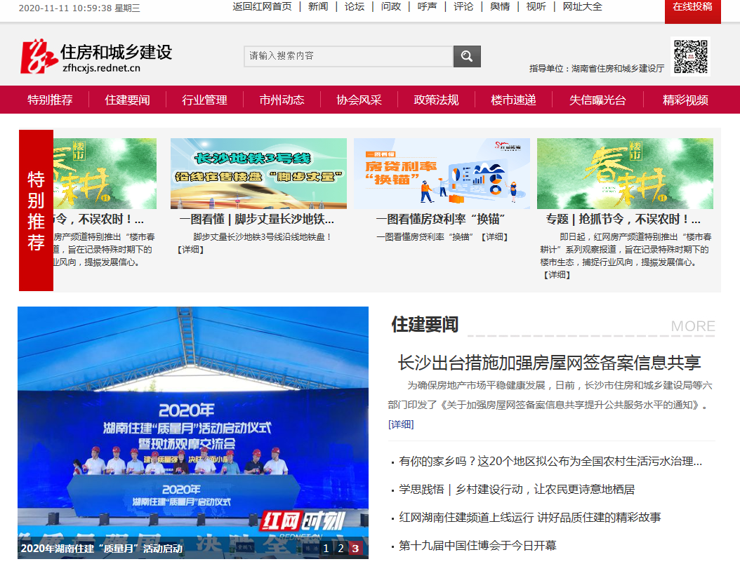 11月9日,由湖南住房和城鄉建設廳主辦、紅網承辦的紅網湖南住建頻道PC端上線運行。當天,時刻新聞客戶端湖南住建頻道也同步上線。這標志著湖南住建行業迎來了新的展示窗口。