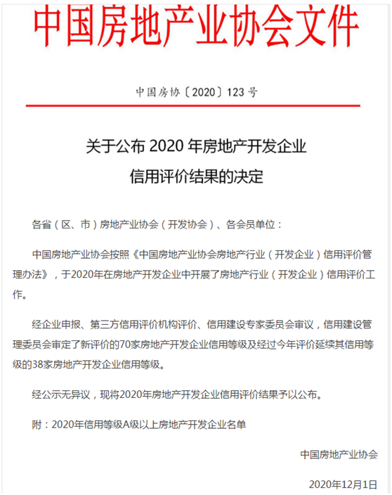 附件:關于公布2020年房地產開發(fā)企業(yè)信用評價結果的決定