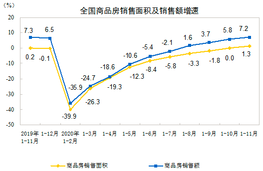 ??1—11月份,商品房銷售面積150834萬平方米,同比增長1.3%,增速比1—10月份提高1.3個百分點。其中,住宅銷售面積增長1.9%,辦公樓銷售面積下降12.8%,商業營業用房銷售面積下降11.1%。商品房銷售額148969億元,增長7.2%,增速提高1.4個百分點。其中,住宅銷售額增長9.5%,辦公樓銷售額下降10.7%,商業營業用房銷售額下降13.7%。