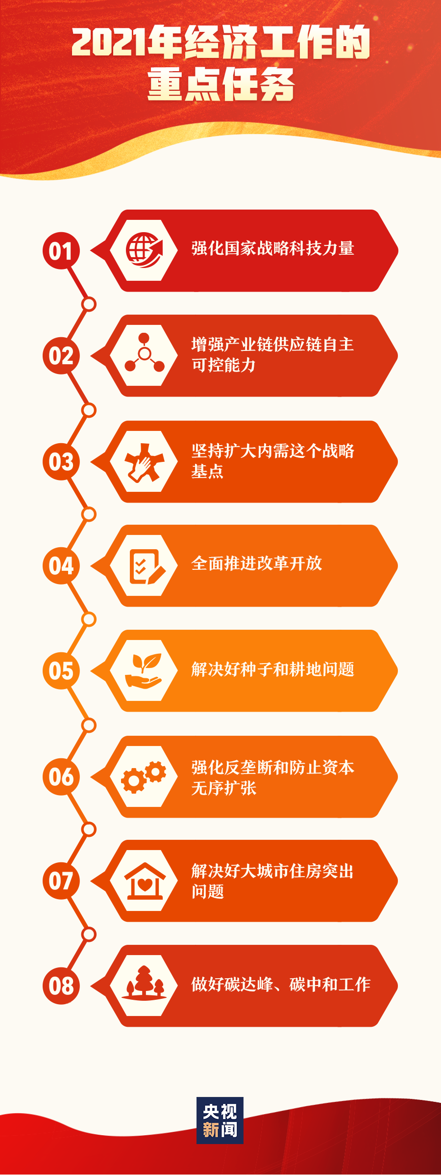 12月16日至18日,中央經濟工作會議在北京舉行。習近平在會上發表重要講話,總結2020年經濟工作,分析當前經濟形勢,部署2021年經濟工作。 面對復雜的國內外形勢以及新冠肺炎疫情的嚴重沖擊,2021年經濟工作的重點任務有哪些?具體該如何做?一起劃重點↓↓↓