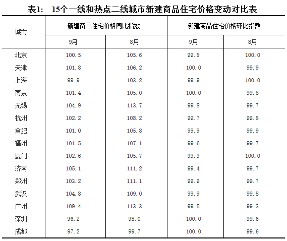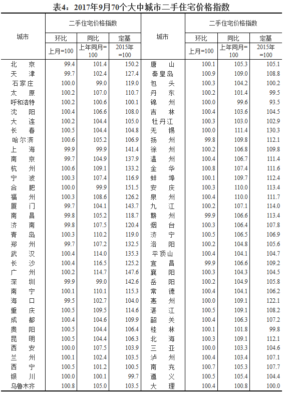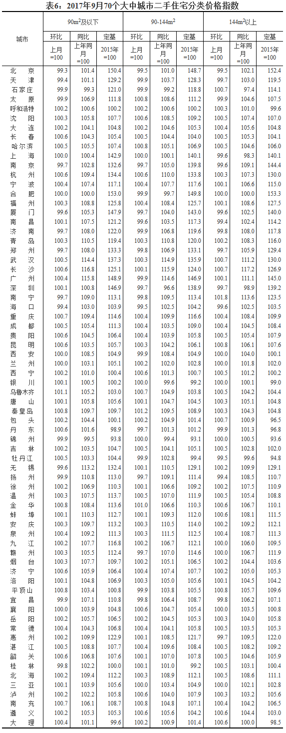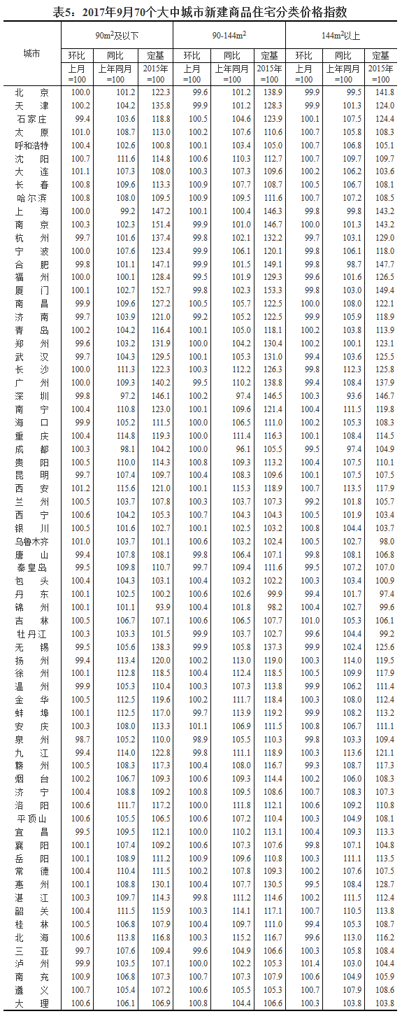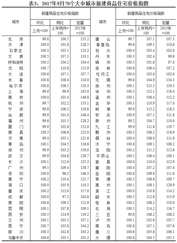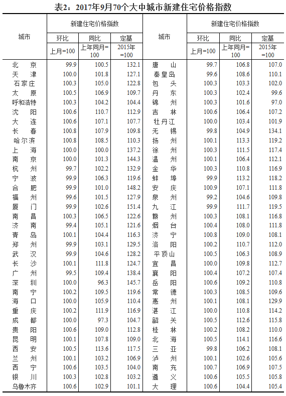 [國家統計局]2017年9月份70個大中城市住宅銷售價格變動情況