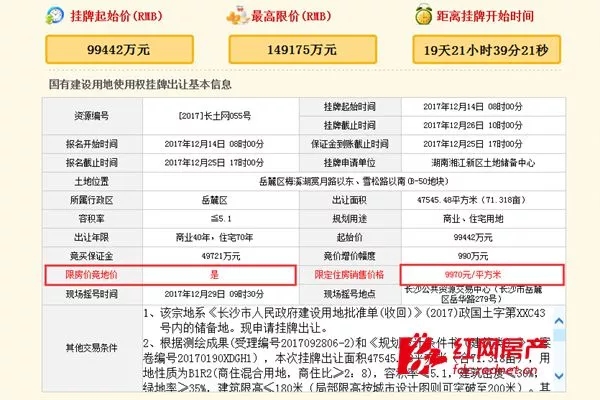 根據(jù)交易條件,該地塊最高限價(jià)為149175萬元(折合樓面地價(jià)6152元/平方米),該宗住宅用地限定房屋銷售價(jià)為9970元/平方米(精裝修價(jià)格不計(jì)入房屋銷售價(jià),精裝修價(jià)格由住建委按規(guī)定確定,下同)。同時(shí),該宗地達(dá)到土地交易最高限價(jià)時(shí),則按《長沙市住宅用地“限房價(jià)、競地價(jià)”試點(diǎn)操作規(guī)則》和《長沙市國土資源交易現(xiàn)場搖號(hào)操作實(shí)施細(xì)則》的規(guī)定進(jìn)行資格審查,資格審查合格的競買人方可參與現(xiàn)場搖號(hào)。