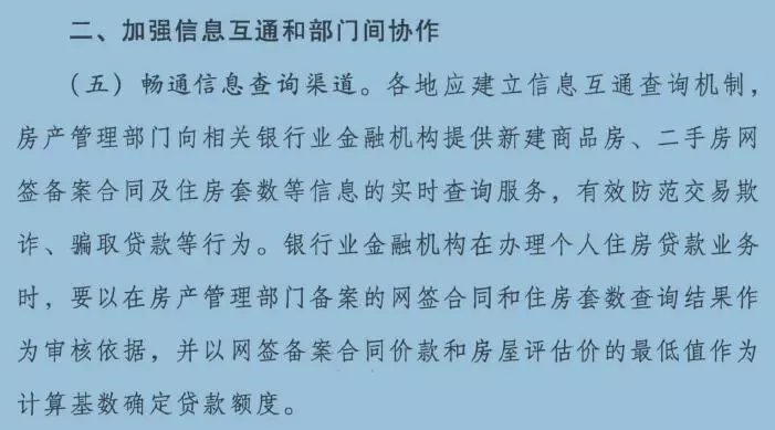 通知要求各地房產(chǎn)管理部門、地方金融監(jiān)管部門會同人民銀行、銀監(jiān)會各派出機構(gòu)建立聯(lián)動工作機制,加強信息互通和部門間協(xié)作。各地房產(chǎn)管理部門要向相關(guān)銀行業(yè)金融機構(gòu)提供新建商品房、二手房網(wǎng)簽備案合同及住房套數(shù)等信息的實時查詢服務(wù),銀行業(yè)金融機構(gòu)在辦理個人住房貸款業(yè)務(wù)時,要以在房產(chǎn)管理部門備案的網(wǎng)簽合同和住房套數(shù)查詢結(jié)果作為審核依據(jù),并以網(wǎng)簽備案合同價款和房屋評估價的最低值作為計算基數(shù)確定貸款額度,有效防范交易欺詐、騙取貸款等行為。