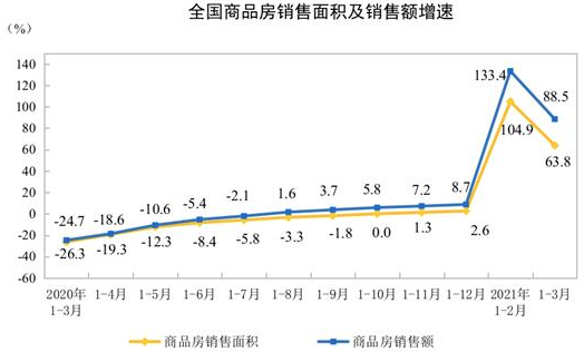 ??1—3月份,商品房銷售面積36007萬平方米,同比增長63.8%;比2019年1—3月份增長20.7%,兩年平均增長9.9%。其中,住宅銷售面積增長68.1%,辦公樓銷售面積增長34.4%,商業(yè)營業(yè)用房銷售面積增長24.9%。商品房銷售額38378億元,增長88.5%;比2019年1—3月份增長41.9%,兩年平均增長19.1%。其中,住宅銷售額增長95.5%,辦公樓銷售額增長44.0%,商業(yè)營業(yè)用房銷售額增長25.8%。