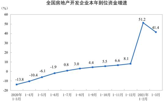 ??1—3月份,房地產(chǎn)開發(fā)企業(yè)到位資金47465億元,同比增長41.4%;比2019年1—3月份增長21.9%,兩年平均增長10.4%。其中,國內(nèi)貸款7222億元,增長7.5%;利用外資11億元,下降41.0%;自籌資金13015億元,增長21.0%;定金及預收款17759億元,增長86.1%;個人按揭貸款7843億元,增長50.0%。