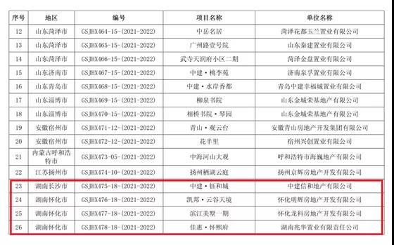 12月29日,由中國房地產業協會、住房和城鄉建設部住宅產業化促進中心共同組織的第十屆(2021-2022年度)“廣廈獎”第三批候選項目名單重磅出爐!經湖南省房地產業協會推薦的長沙市“中建?鈺和城”、懷化市“凱邦?云谷天境”“濱江美墅一期”“佳惠?懷熙府”四個項目榮獲殊榮!