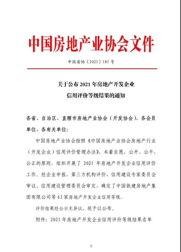 12月29日,中國房地產業協會公布2021年信用等級AAA房地產開發企業名單,我會會員單位中建信和地產有限公司、湖南澳海房地產開發有限公司、湖南中建信和智慧谷置業有限公司獲得“2021年信用等級AAA級房地產開發企業”評價。