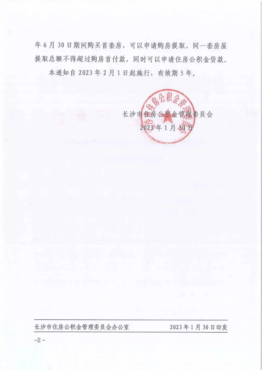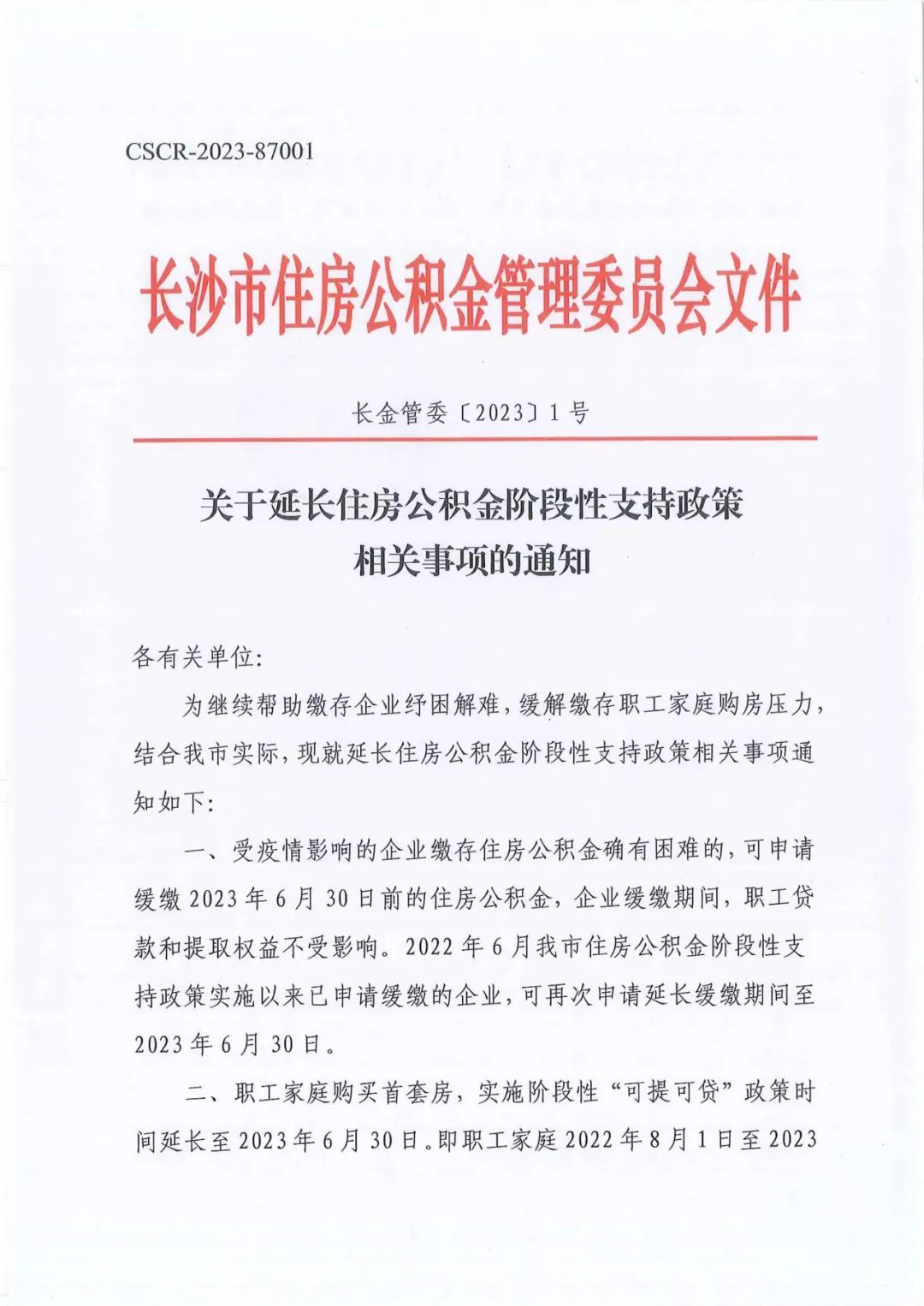 另外,長沙住房公積金還發布了關于延長住房公積金階段性支持政策相關事項的通知。如下:為繼續幫助繳存企業紓困解難,緩解繳存職工家庭購房壓力結合我市實際,現就延長住房公積金階段性支持政策相關事項通知如下:一、受疫情影響的企業繳存住房公積金確有困難的,可申請緩繳2023年6月30日前的住房公積金,企業緩繳期間,職工貸款和提取權益不受影響。2022 年6月我市住房公積金階段性支持政策實施以來已申請緩繳的企業,可再次申請延長緩繳期間至2023年6月30日。二、職工家庭購買首套房,實施階段性“可提可貸”政策時間延長至2023年6月30日。即職工家庭2022年8月1日至2023年6月30日期間購買首套房,可以申請購房提取,同一套房屋提取總額不得超過購房首付款,同時可以申請住房公積金貸款。本通知自2023年2月1日起施行,有效期5年。