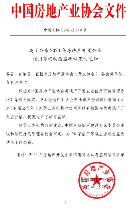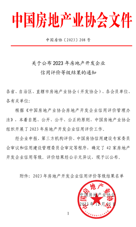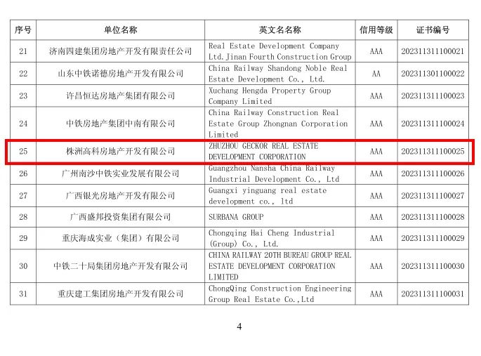 近日,中國房地產業協會公布了《2023年房地產開發企業信用評價等級結果》。2023年全國房地產開發企業獲得信用評價等級共有42家。在湖南省房地產業協會的組織和推薦下,株洲高科房地產開發有限公司獲得信用評價AAA等級。