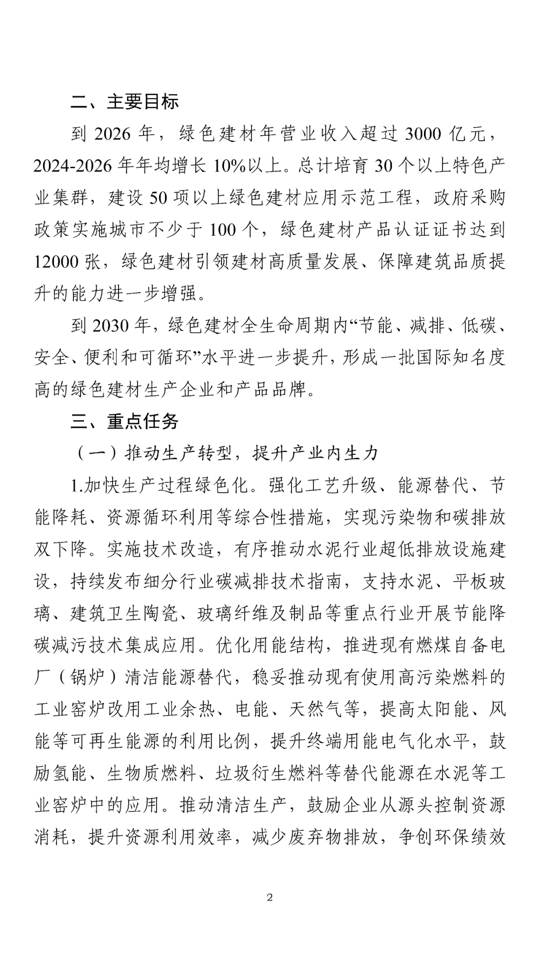 《方案》提出,到2026年,綠色建材年?duì)I業(yè)收入超過3000億元,2024-2026年年均增長10%以上。總計(jì)培育30個(gè)以上特色產(chǎn)業(yè)集群,建設(shè)50項(xiàng)以上綠色建材應(yīng)用示范工程,政府采購政策實(shí)施城市不少于100個(gè),綠色建材產(chǎn)品認(rèn)證證書達(dá)到12000張,綠色建材引領(lǐng)建材高質(zhì)量發(fā)展、保障建筑品質(zhì)提升的能力進(jìn)一步增強(qiáng)。