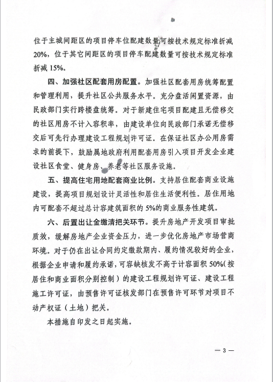 第三,優(yōu)化項(xiàng)目報(bào)建環(huán)節(jié),小幅緩解開發(fā)商資金壓力。針對(duì)履約較好的企業(yè),可容缺核發(fā)不高于計(jì)容面積50%(按居住和商業(yè)面積分別控制)的建設(shè)工程規(guī)劃許可證、建設(shè)工程施工許可證,有利于開發(fā)商報(bào)建具體手續(xù)辦理環(huán)節(jié),確保報(bào)建更靈活便捷。