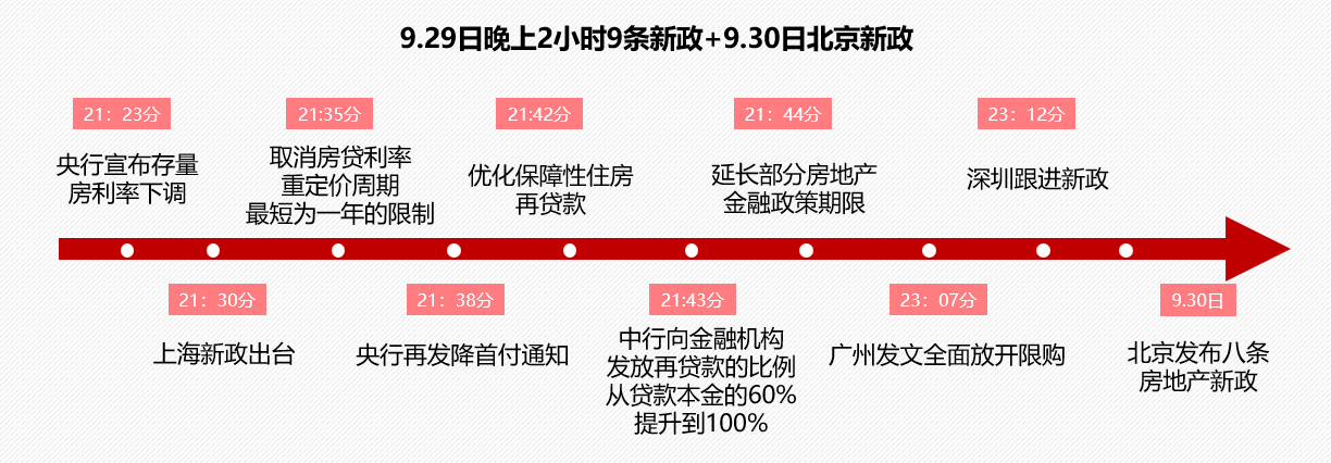 隨后在9月29日,時(shí)值國(guó)慶小長(zhǎng)假前期,一系列利好政策來(lái)襲。央行金融四箭齊發(fā),一線城市集中出臺(tái)重磅新政松綁“四限”響應(yīng)“止跌回穩(wěn)”。