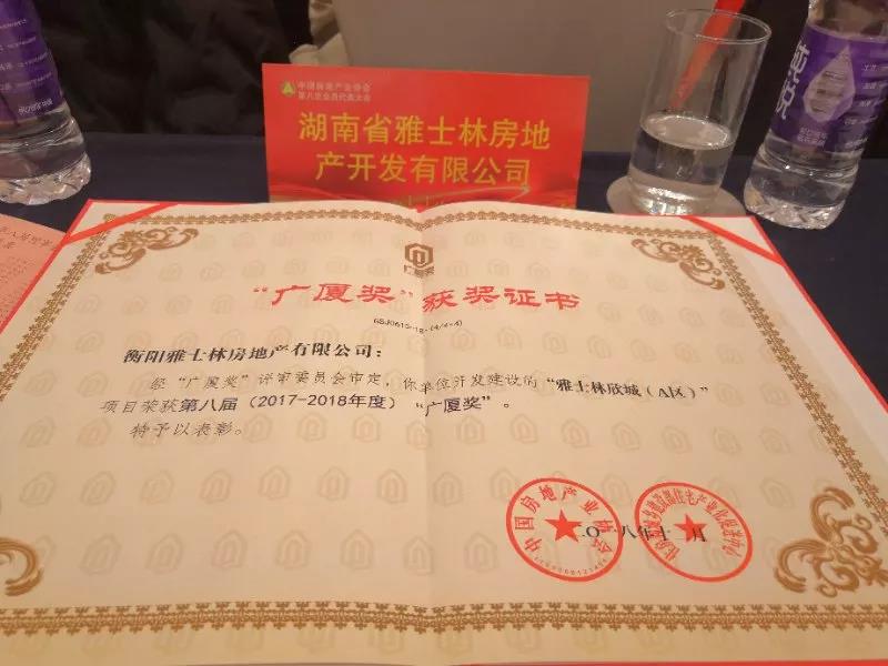 2018年12月20日,第八屆(2017-2018年度)中國房地產“廣廈獎”揭曉,雅士林欣城(A區)項目脫穎而出,榮獲“廣廈獎”表彰。
