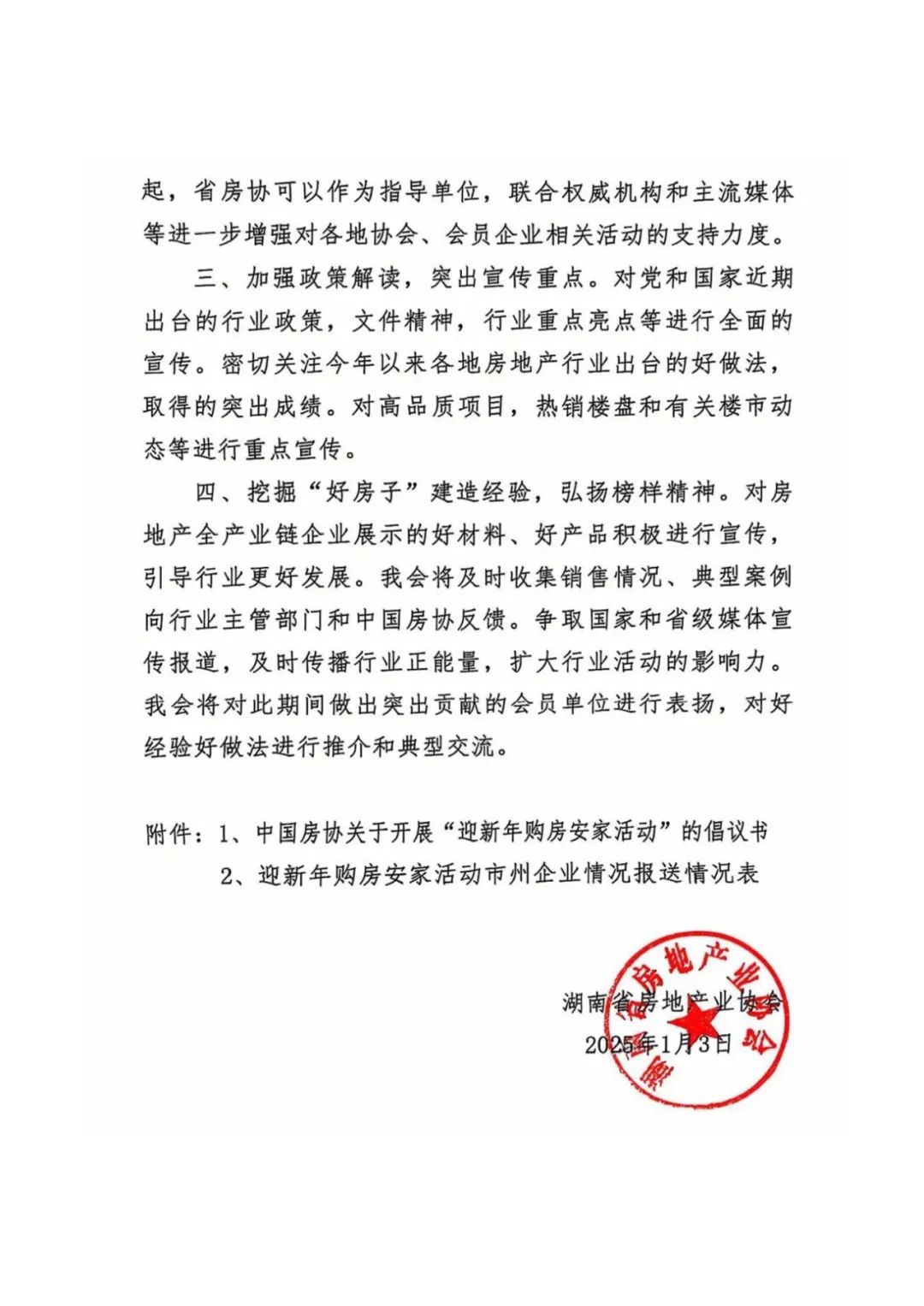 2025年1月3日,湖南省房地產業協會發布《關于開展“迎新年購房安家活動”做好行業宣傳引導工作的倡議書》(以下簡稱“倡議書”)。在“百城千企商品房促銷活動" 和 “方便看房活動"的基礎上,進一步向全省房地產行業發出開展做好行業宣傳引導工作,促進房地產市場止跌回穩。