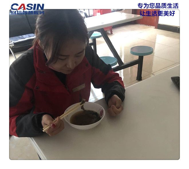 ___疫情期間,食堂實行分餐制,忙碌了一上午的客服小姐姐廖宇紅,比其他同事晚了30分鐘,才到食堂的吃著午餐。