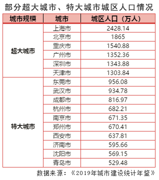另據住建部近期公布的《2019年城市建設統計年鑒》,目前城區常住人口超過1000萬的超大城市有6個,分別是:上海、北京、重慶、廣州、深圳和天津。東莞、武漢、成都、杭州、南京、鄭州、西安、濟南、沈陽和青島這10個城市的城區人口處于500萬到1000萬之間,屬于特大城市。