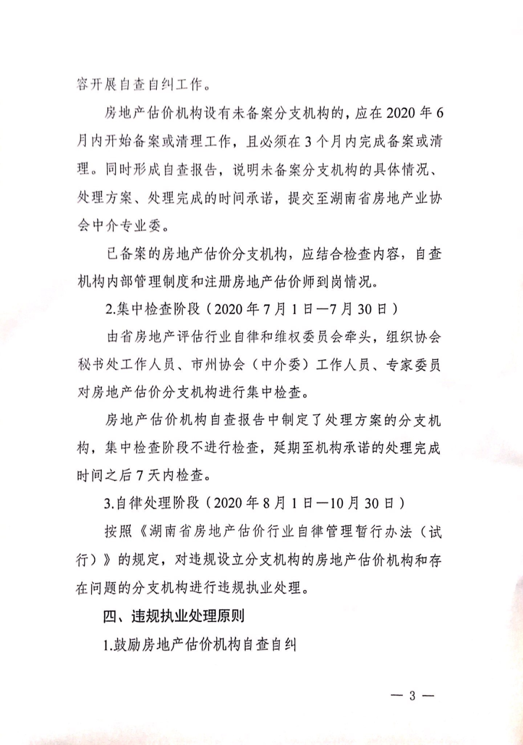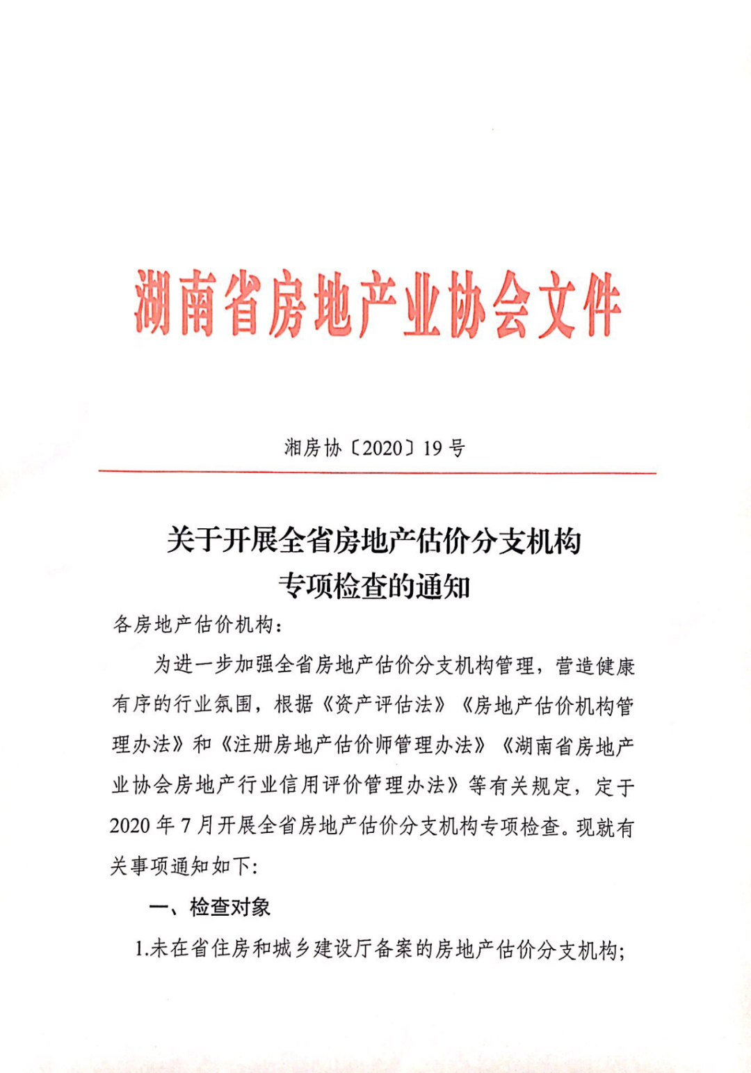 為進一步加強全省房地產估價分支機構管理,營造健康有序的行業氛圍,根據《資產評估法》《房地產估價機構管理辦法》和《注冊房地產估價師管理辦法》《湖南省房地產業協會房地產行業信用評價管理辦法》等有關規定,定于2020年7月開展全省房地產估價分支機構專項檢查。現就有關事項通知如下: