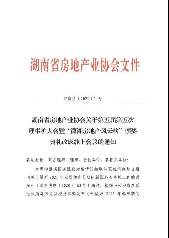 關(guān)于第五屆第五次理事擴(kuò)大會暨“瀟湘房地產(chǎn)風(fēng)云榜”頒獎 典禮改成線上會議的通知