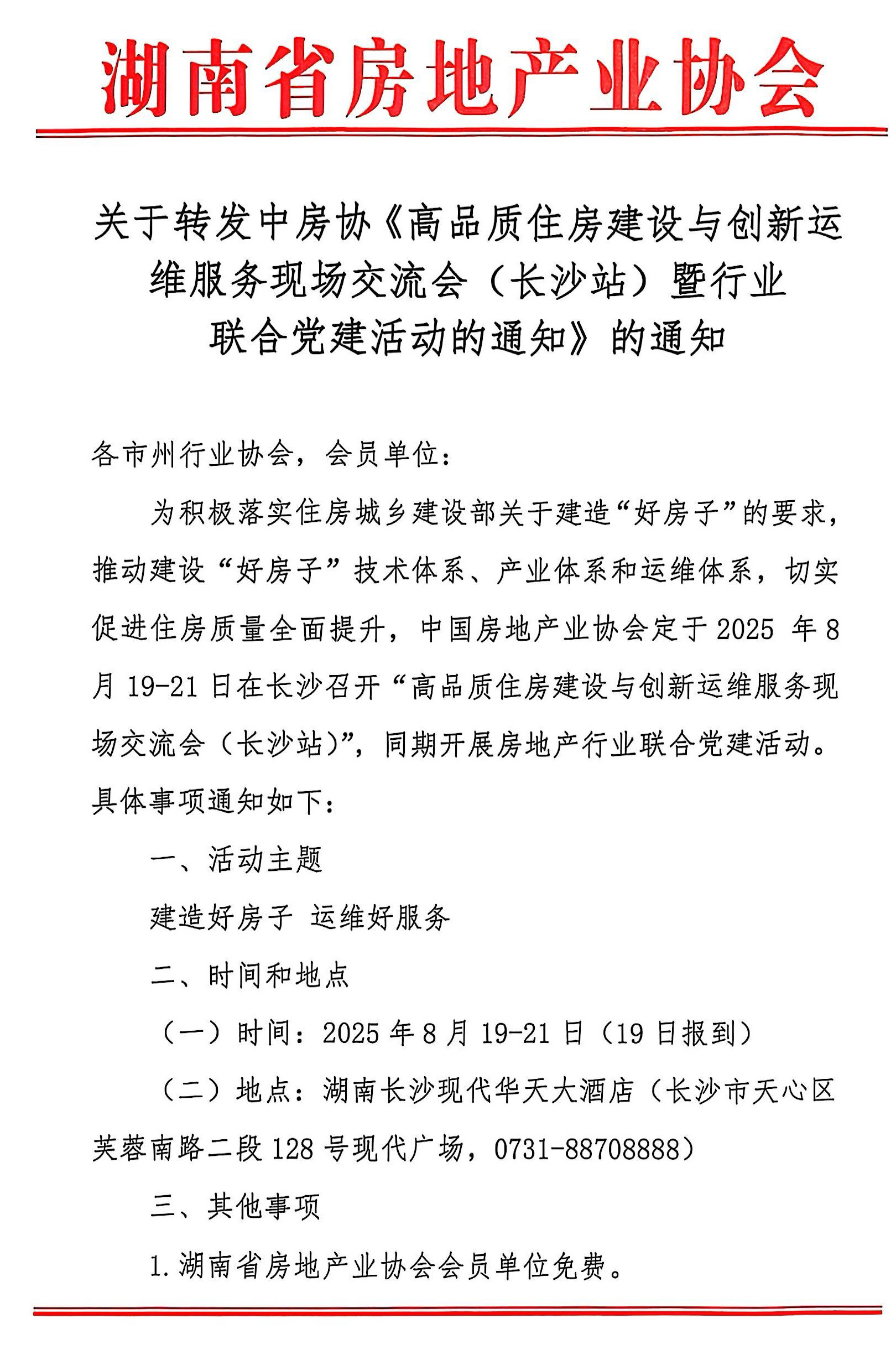 關于轉發中房協《高品質住房建設與創新運維服務現場交流會(長沙站)暨行業聯合黨建活動的通知》的通知