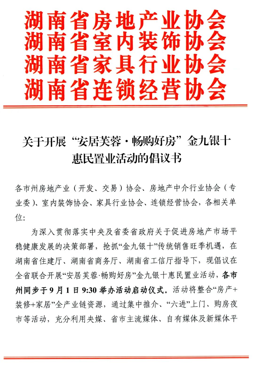 關(guān)于開展“安居芙蓉·暢購好房”金九銀十惠民置業(yè)活動的倡議書