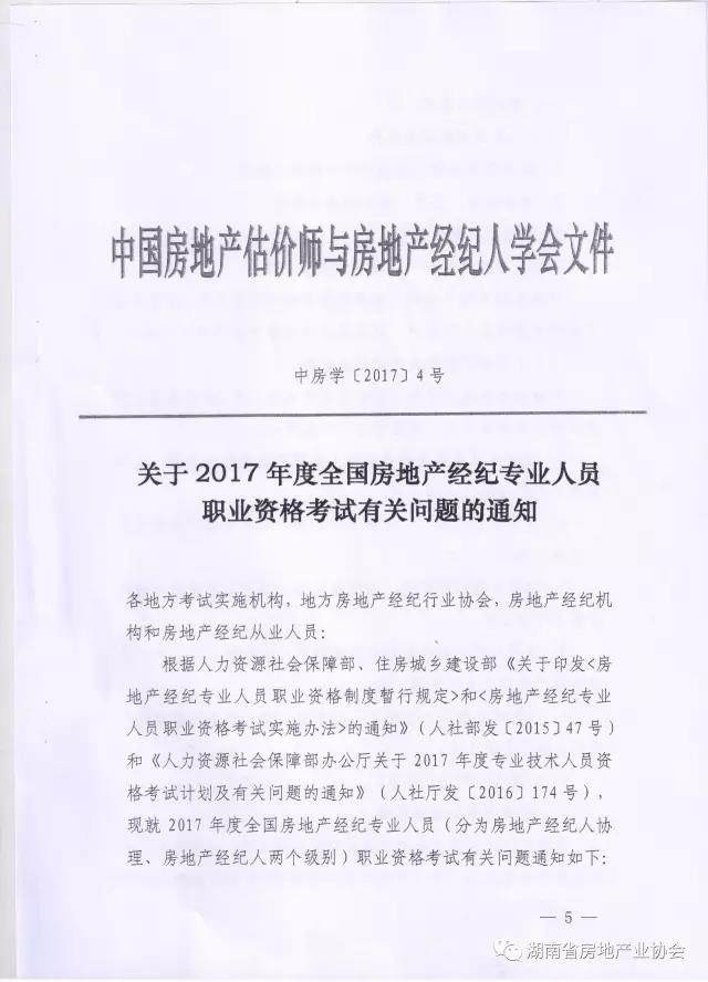 湖南省房地產業協會轉發《中國房地產估價師與房地產經紀人學會關于2017年度全國房地產經紀專業人員職業資格考試有關問題的通知》