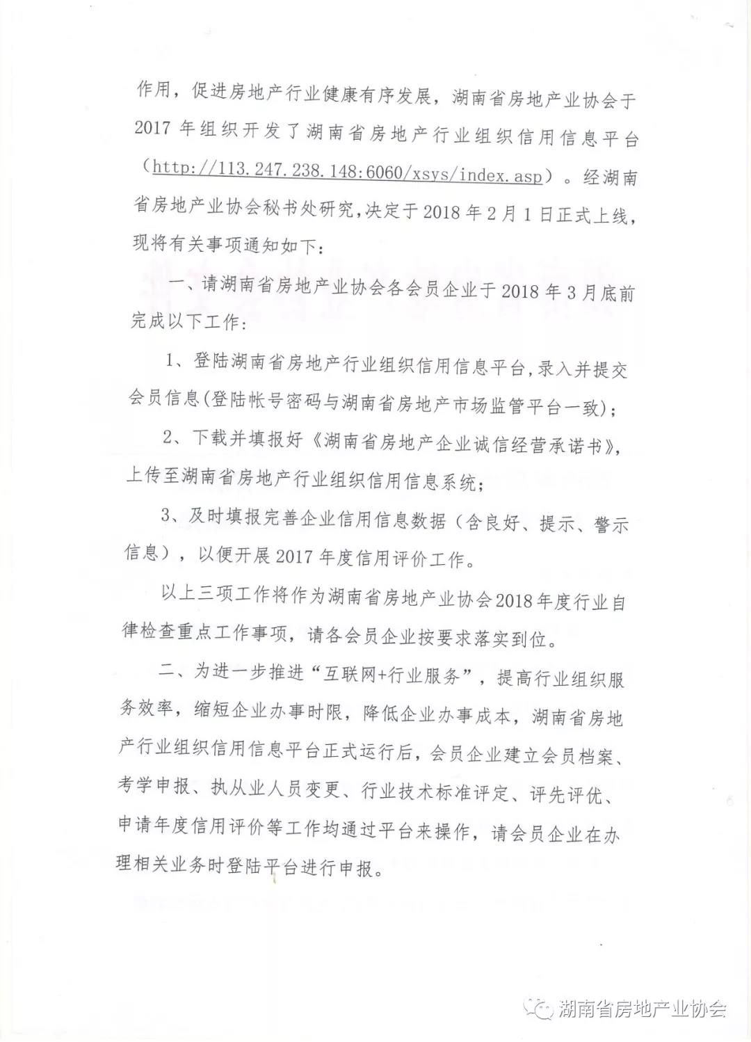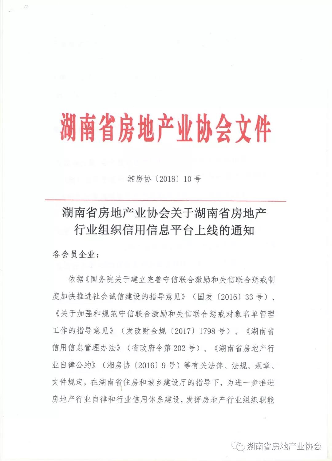 關于湖南省房地產行業組織信用信息平臺上線的通知