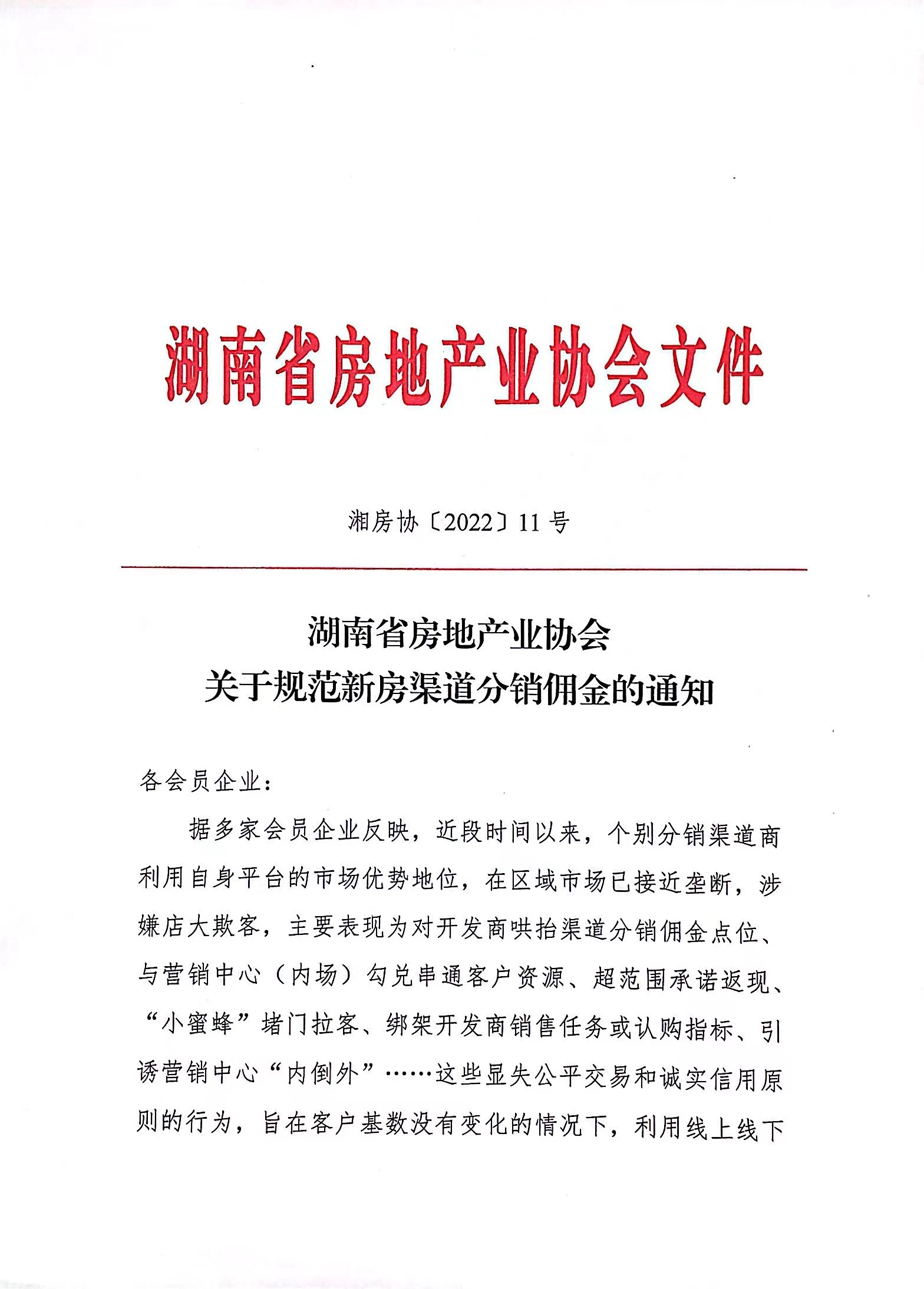 關于規范新房渠道分銷傭金的通知