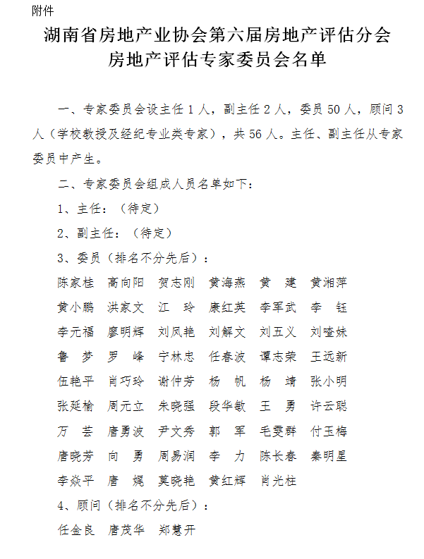 關(guān)于湖南省房地產(chǎn)業(yè)協(xié)會第六屆房地產(chǎn)評估分會房地產(chǎn)評估專家委員會名單的公示