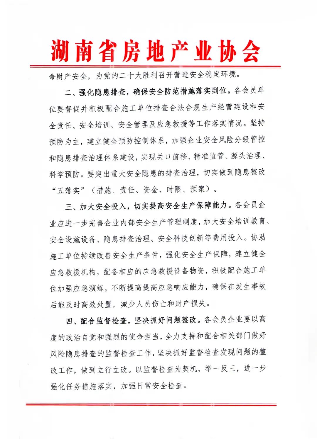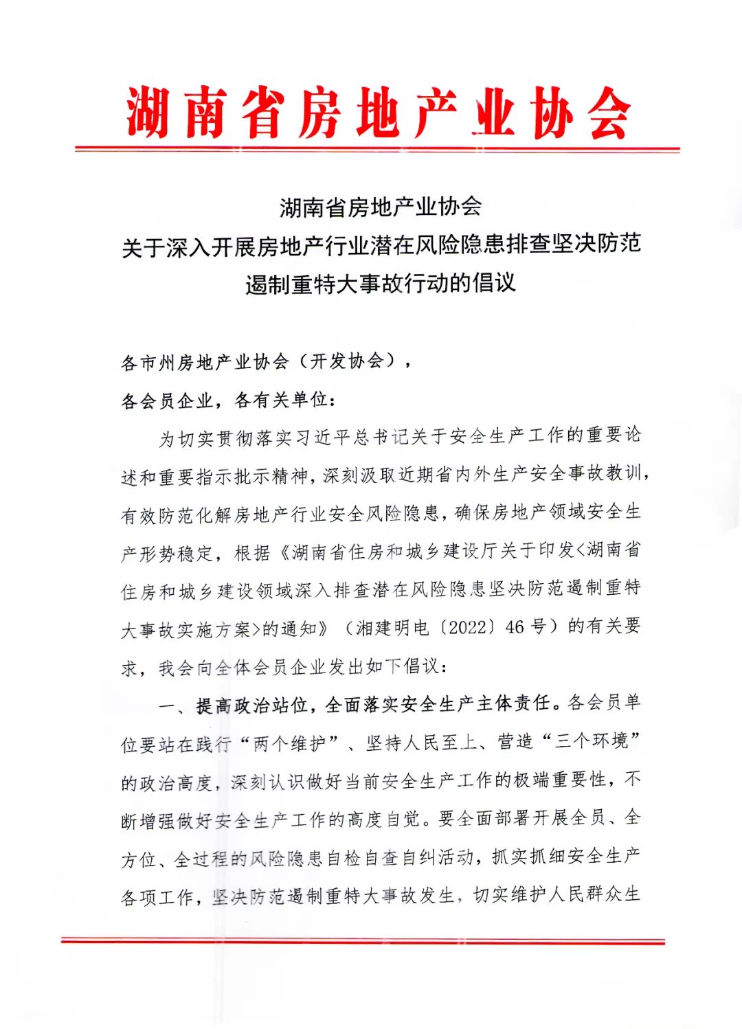 為切實(shí)貫徹落實(shí)習(xí)近平總書(shū)記關(guān)于安全生產(chǎn)工作的重要論述和重要指示批示精神,深刻汲取近期省內(nèi)外生產(chǎn)安全事故教訓(xùn),有效防范化解房地產(chǎn)行業(yè)安全風(fēng)險(xiǎn)隱患,確保房地產(chǎn)領(lǐng)域安全生產(chǎn)形勢(shì)穩(wěn)定,根據(jù)《湖南省住房和城鄉(xiāng)建設(shè)廳關(guān)于印發(fā)<湖南省住房和城鄉(xiāng)建設(shè)領(lǐng)域深入排查潛在風(fēng)險(xiǎn)隱患堅(jiān)決防范遏制重特大事故實(shí)施方案>的通知》(湘建明電〔2022〕46號(hào))的有關(guān)要求,我會(huì)向全體會(huì)員企業(yè)發(fā)出如下倡議: