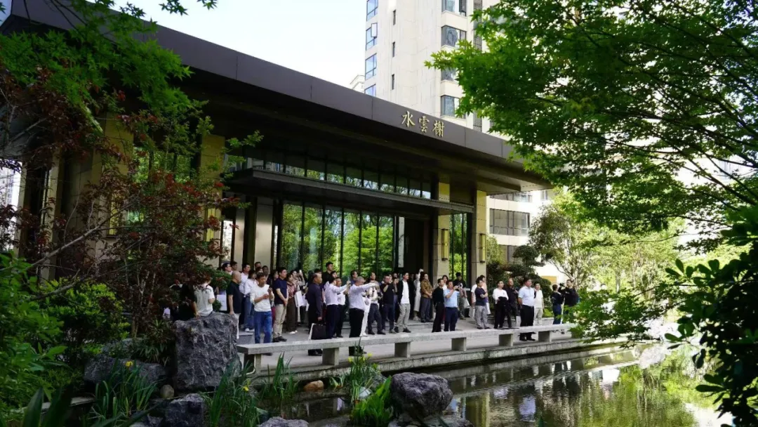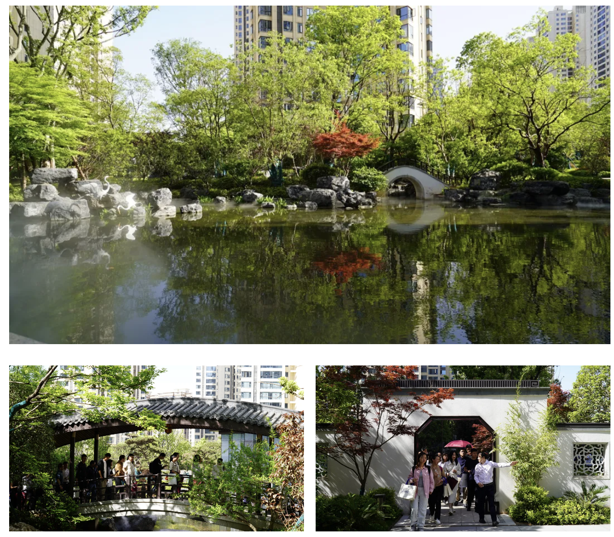 項目園林以“一池、三山、三舍、八境”為設計脈絡,融合低影響開發(fā)理念,保留原始山體,打造約3萬方中央公園,營造出“推窗見綠、漫步即景”的生態(tài)社區(qū)。與會嘉賓對園林的優(yōu)雅中式布局及與自然和諧共生的設計理念表示高度贊賞。
