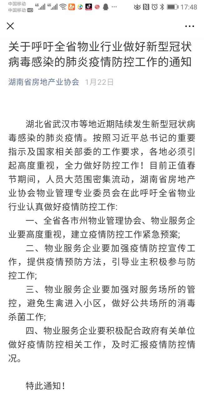 疫情就是命令,防控就是責(zé)任。肺炎疫情出現(xiàn)后,在國外與家人休年假的宋書記得知消息后第一時(shí)間通過網(wǎng)絡(luò)新聞了解了肺炎疫情概況,并迅速通過微信聯(lián)系了協(xié)會各部門負(fù)責(zé)人,針對疫情做出了應(yīng)急工作安排,當(dāng)天更是改簽了自己和家人回家的機(jī)票,提前取消了自己和家人的假期。1月26日,協(xié)會向全行業(yè)發(fā)布關(guān)于預(yù)防新型冠狀病毒感染肺炎疫情蔓延的倡議書,號召全行業(yè)和企業(yè)積極應(yīng)對,高度重視科學(xué)理性做好防范措施,同心協(xié)力打贏疫情防控狙擊戰(zhàn)。前期重點(diǎn)對我省物業(yè)行業(yè)發(fā)出了呼吁,要求做好新型冠狀病毒感染的肺炎疫情防控工作,要求建立疫情防控工作緊急預(yù)案,加強(qiáng)疫情防控宣傳,引導(dǎo)業(yè)主積極參與防控工作,同時(shí)加強(qiáng)服務(wù)場所的管控,做好公共場所的消毒殺菌工作,并要積極配合政府有關(guān)單位做好疫情防控工作,及時(shí)匯報(bào)疫情情況。隨著疫情的迅速爆發(fā),防疫形勢愈加嚴(yán)峻,為認(rèn)真貫徹落實(shí)和加強(qiáng)行業(yè)疫情防控工作,回國后宋書記更是召集黨支部各支委和各部門負(fù)責(zé)人召開疫情防控緊急專項(xiàng)會議,結(jié)合協(xié)會工作職能和疫情形勢又對全省房地產(chǎn)業(yè)疫情防控工作進(jìn)行了具體安排和部署。
